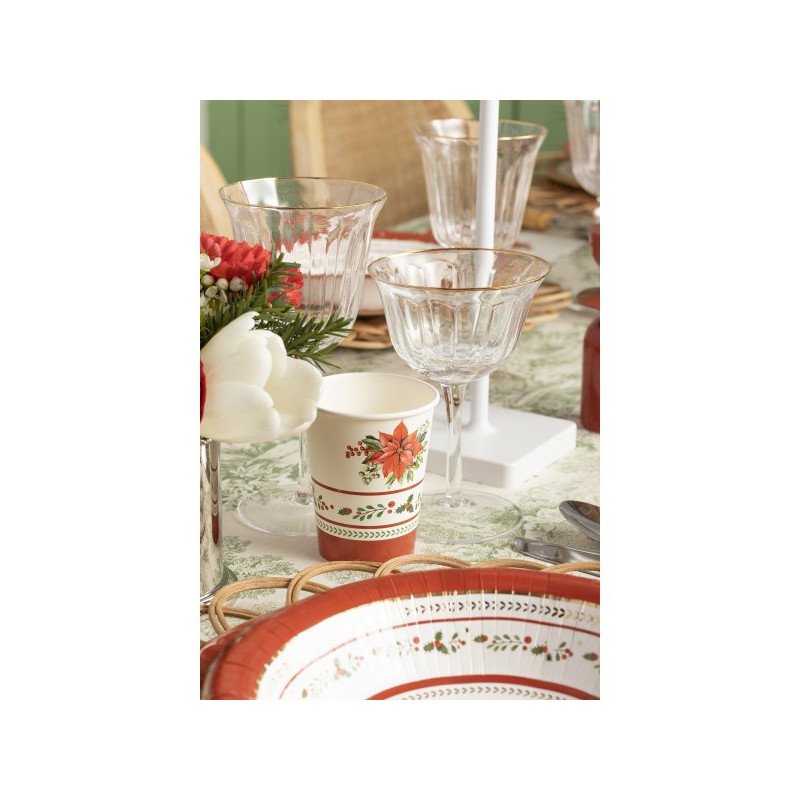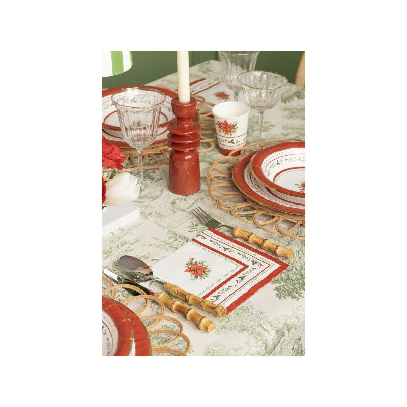 il bordo è adornato da raffinati motivi di agrifoglio, con foglie verde intenso e bacche rosse vivaci, mentre al centro troneggia una splendida stella di Natale dai petali rosso cremisi, come dipinta a mano.