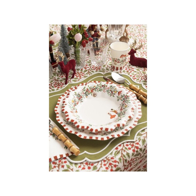 Ogni dettaglio richiama l’incanto del bosco e la grazia del teatro, il tovagliolo round a sfondo bianco è decorato con una palette raffinata che gioca tra il rosso, il verde e l’oro caldo.